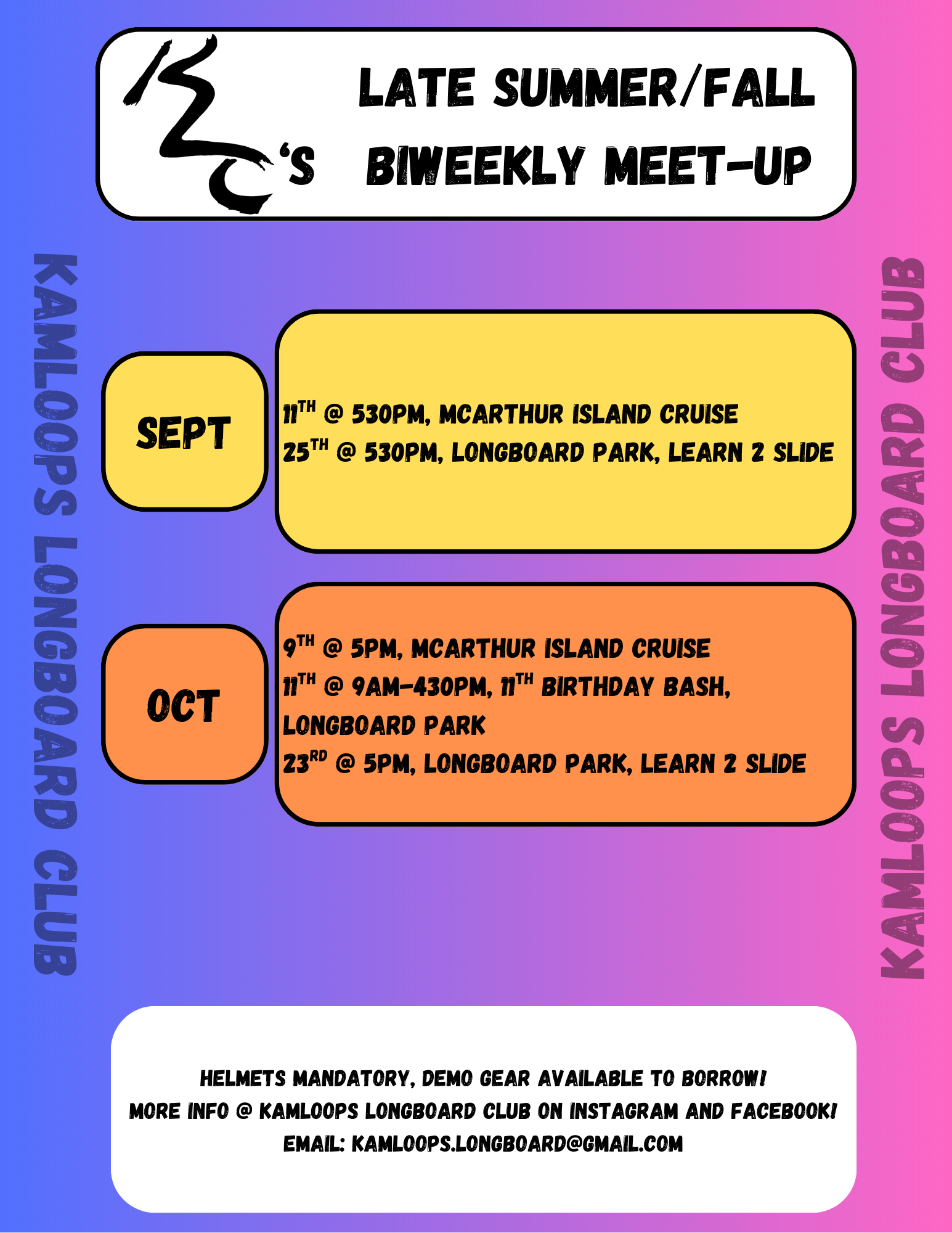 9:30am - Oct 11, 2025 | 11th Annual Birthday Bash | Kamloops Longboard Park, 2350 Pacific Way |